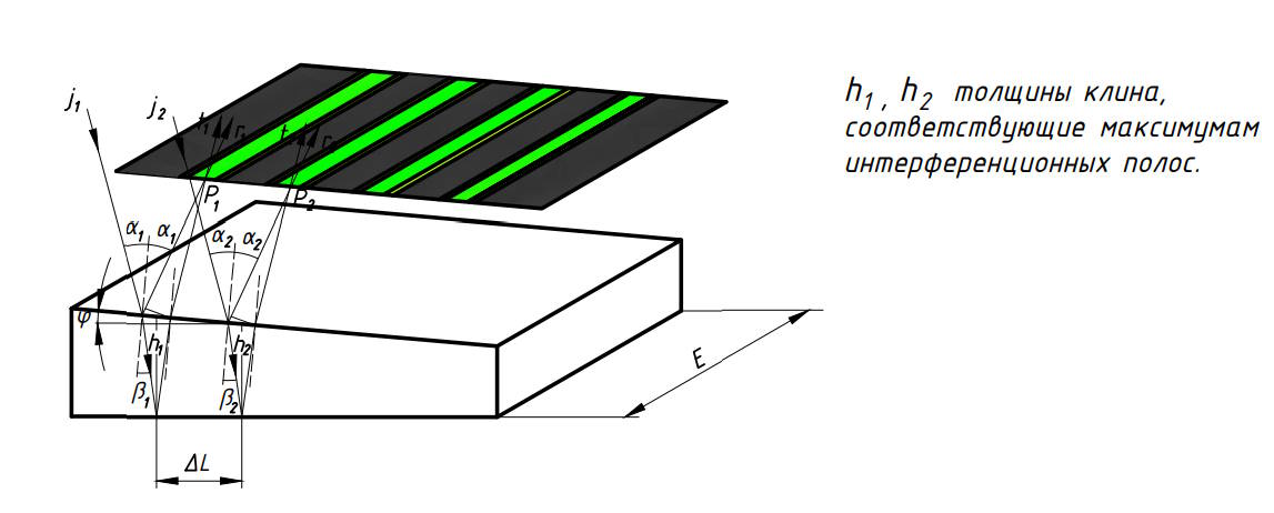 Такая интерференционная картина будет наблюдаться вдоль линии, параллельной ребру клина E, с одинаковым значением толщины — поэтому их называют «полосы равной толщины».