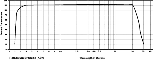 Potassium Bromide is used for windows, lenses and prisms when transmission through the range 0.25µm to 26µm is desired. Potassium Bromide (KBr) is a material commonly used in FTIR spectroscopy (drilled KBR windows). Potassium Bromide is water soluble and KBr windows must be protected against moisture degradation of polished surfaces.